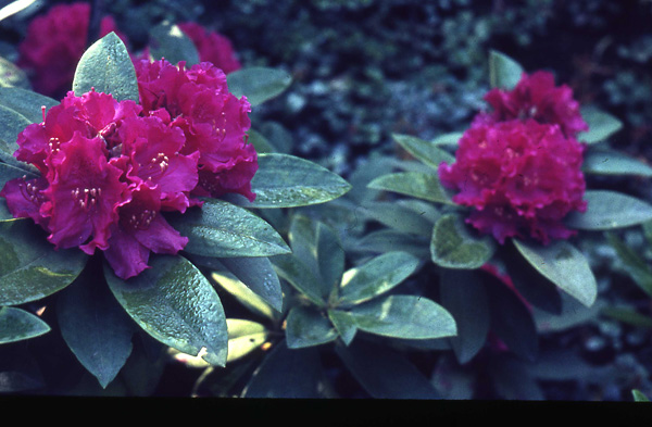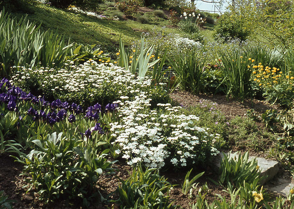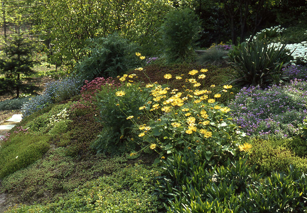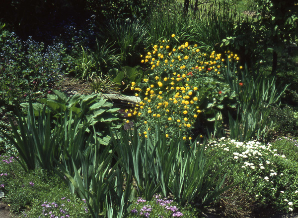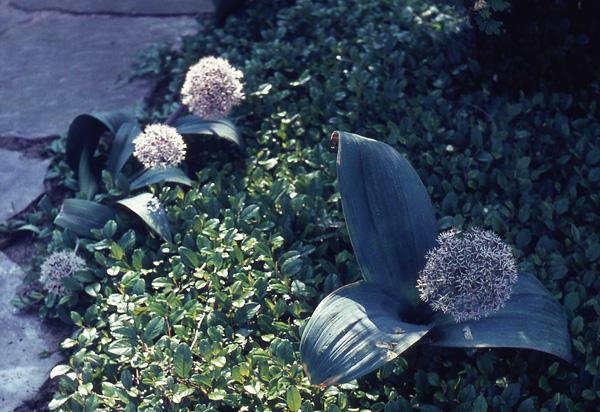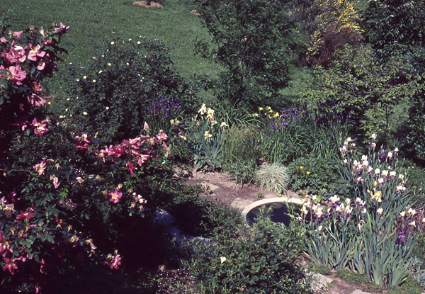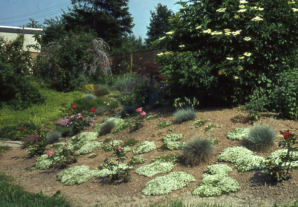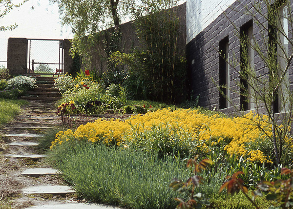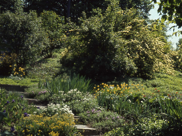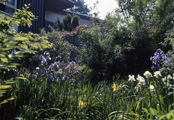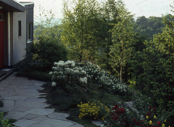 Aufwändig gestaltete Beete an der Garage. Diese noch mit den originalen dem Hang folgend nach unten hin größer werdenden Kippfenstern aus Drahtglas (heute aufgemauert und mit Glasbausteinen verschlossen). |
