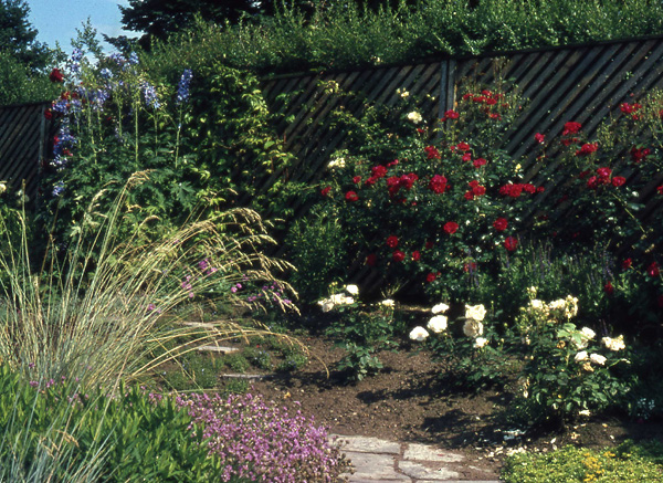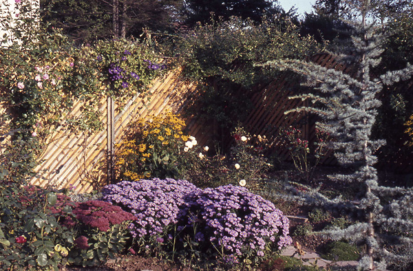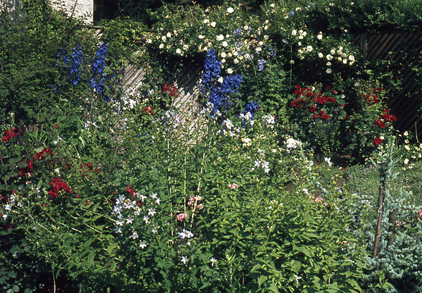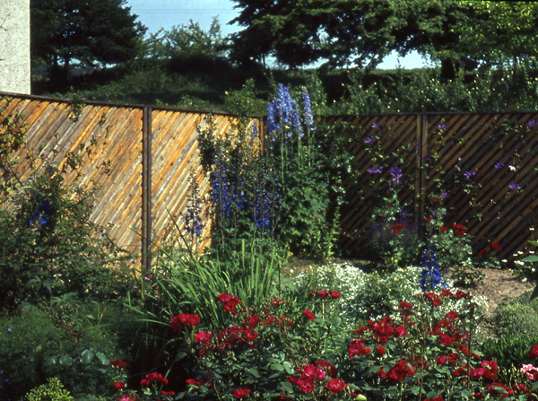 Der üppig gestaltete Terrassengarten mit der von Mattern entworfenen Sichtschutz- und Rankenwand (Entwurf April 1959, Realisierung Juli 1959). Zwischenzeitlich erneuert entspricht der heutige Sichtschutzzaun in der Anordnung der einzelnen Felder sowie in der Gestaltung selbiger nicht mehr dem ursprünglichen Entwurf. |