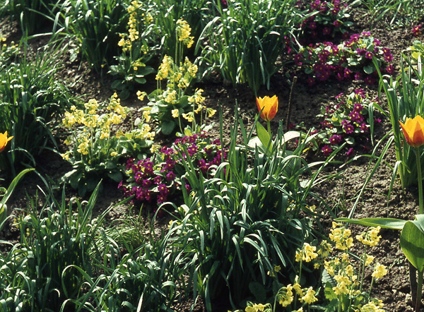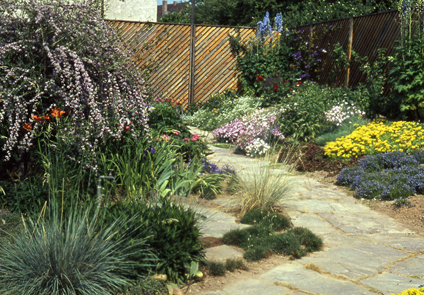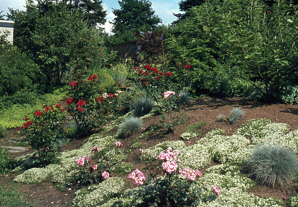 Bunt bepflanzte Beete im Eingangsbereich sowie Büsche und Bäume als "grüne Wand" zum Nachbarn hin. |