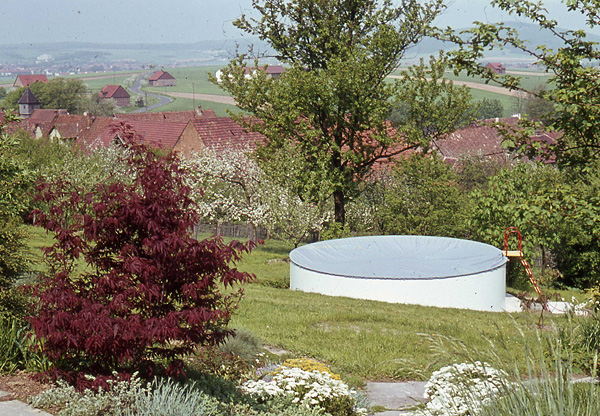 Ein Schwimmbad für Carlsdorf! Heute öfters zu finden, damals der pure Luxus: der neu errichtete Pool Anfang der 1960er Jahre. Privates Badevergnügen im großzügigen Garten. |
