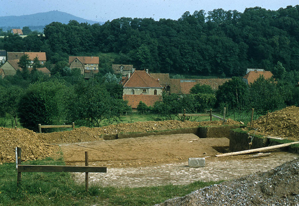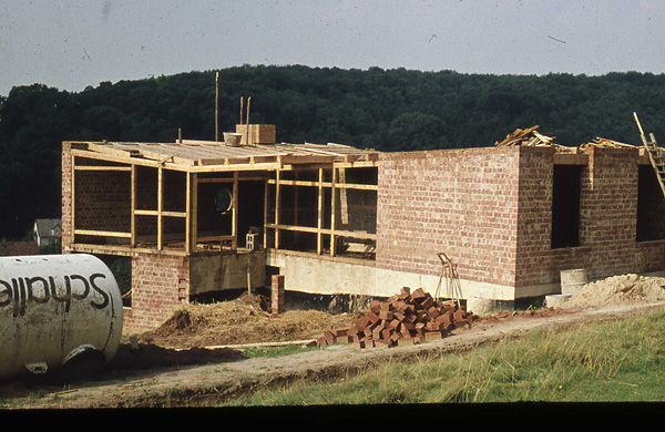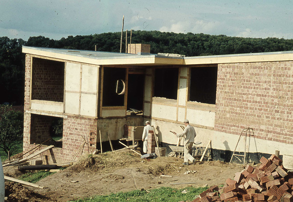 Die Bauarbeiten gehen voran. Schön zu erkennen das Fundament für eine von Mattern geplante Stahlstütze im Terrassenbereich, die jedoch auf Wunsch des Bauherrn nicht realisiert wurde. Als gestalterisches Element und zur Stabilisierung des auskragenden Daches soll diese im Zuge der Sanierung jedoch verwirklicht werden. |