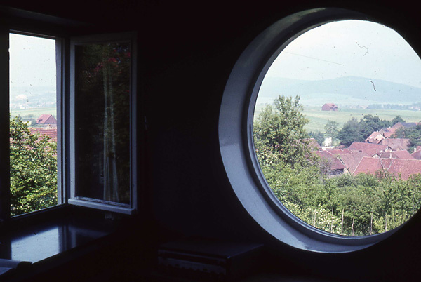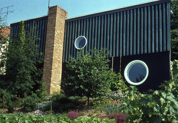 Blick vom Schützenplatz auf das Haus. Die Terrassentür zum Wohnzimmer ist geöffnet, so dass sich eine optische Täuschung ergibt. Man blickt direkt hinein in den Wohnraum und sieht das kleine Bullauge in der gegenüberliegenden Wand - und doch macht der erste Eindruck glauben, als befände sich dieses in der Tür zur Terrasse. |