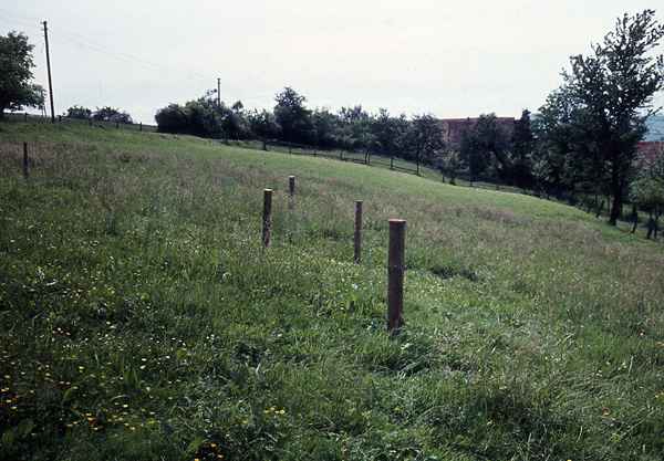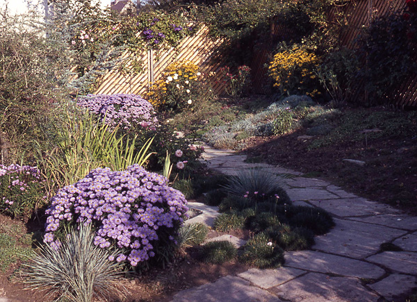 Der Plattenweg vom Haus zur Garage. Die Obstbäume rechts im Bild stehen noch zum Teil oder wurden durch neue Bäume ersetzt. Der Hang links im Bild ist heute nur noch mit einer Sorte Bodendecker begrünt. Die Bäume fehlen. |