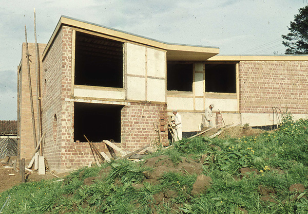 Juli 1958. Teile des Rohbaus stehen. Sehr schön zu erkennen die Holzständerbauweise im Bereich von Wohnzimmer und Küche. Vorne links im Bild der Erdtank für die Ölheizung. |