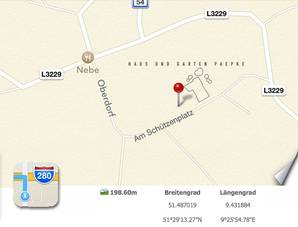 --> Anfahrt aus Richtung Hofgeismar: Sie fahren auf der L3229 in den Ort Carlsdorf hinein. Kurz nach dem Ortsschild erblicken Sie rechter Hand die Hugenottenkirche, einen wunderschönen Fachwerkbau. Etwa 100 Meter weiter, ebenfalls auf der rechten Seite, befindet sich das ehemalige Gasthaus Nebe. Hier bitte rechts abbiegen und den steilen Berg hinauffahren ("Oberdorf"). Ganz oben macht die Straße einen Knick nach links ("Am Schützenplatz"). Fahren Sie noch etwa 70 Meter weiter. Linksseitig erblicken Sie die freistehende Garage, 80 Meter weiter das Wohnhaus "Haus Paepke". Es steht ein etwa 50 Meter langer Parkstreifen zur Verfügung (das Parken ist kostenlos). --> Anfahrt aus Richtung Udenhausen: Sie fahren auf der L3229 in den Ort Carlsdorf hinein und nehmen gleich die erste Straße links ("Am Schützenplatz"). Fahren Sie etwa 200 Meter bis Sie auf der rechten Seite "Haus Paepke" (Hausnummer 5) sehen. Nutzen Sie den Parkstreifen auf der linken Seite (Wendemöglichkeit 80 Meter weiter in Höhe der Garage). --> Anfahrt aus Richtung Hombressen: Sie fahren auf der K54 in den Ort Carlsdorf hinein. Biegen Sie an der großen T-Kreuzung in der Ortsmitte rechts ab ("Mühlenweg") und dann gleich wieder in die erste Straße links ein ("Oberdorf"). Ganz oben macht die Straße einen Knick nach links ("Am Schützenplatz"). Fahren Sie noch etwa 70 Meter weiter. Linksseitig erblicken Sie die freistehende Garage, 80 Meter weiter das Wohnhaus "Haus Paepke". Es steht ein etwa 50 Meter langer Parkstreifen zur Verfügung (das Parken ist kostenlos). |