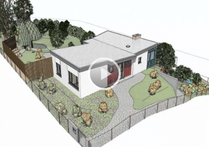 Hier die Animation der geplanten Wiederherstellung der Gesamtanlage auf Grundlage von Frau Brechmacher-Ihnens "Denkmalpflegerischem Zielkonzept für den Garten von Haus Paepke" mitsamt dem neu zu schaffenden Sitzplatz an der Nordseite des Grundstücks im Bereich des ehemaligen Nutzgartens mit einem "Besucherzentrum" nach eigenem Entwurf.