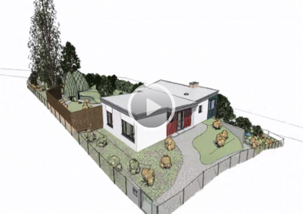 Hier die Animation der geplanten Wiederherstellung der Gesamtanlage auf Grundlage von Frau Brechmacher-Ihnens "Denkmalpflegerischem Zielkonzept für den Garten von Haus Paepke" mitsamt dem neu zu schaffenden Sitzplatz an der Nordseite des Grundstücks im Bereich des ehemaligen Nutzgartens mit einem "Besucherzentrum" nach eigenem Entwurf.